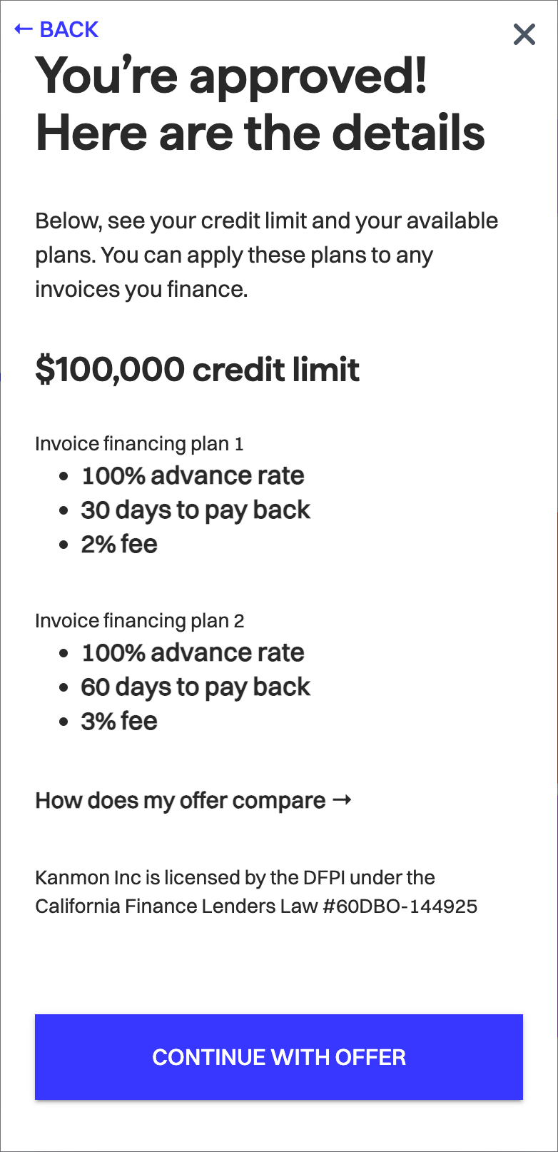 Receivablescomponent, - the “Invoice financing” card displayed by the
