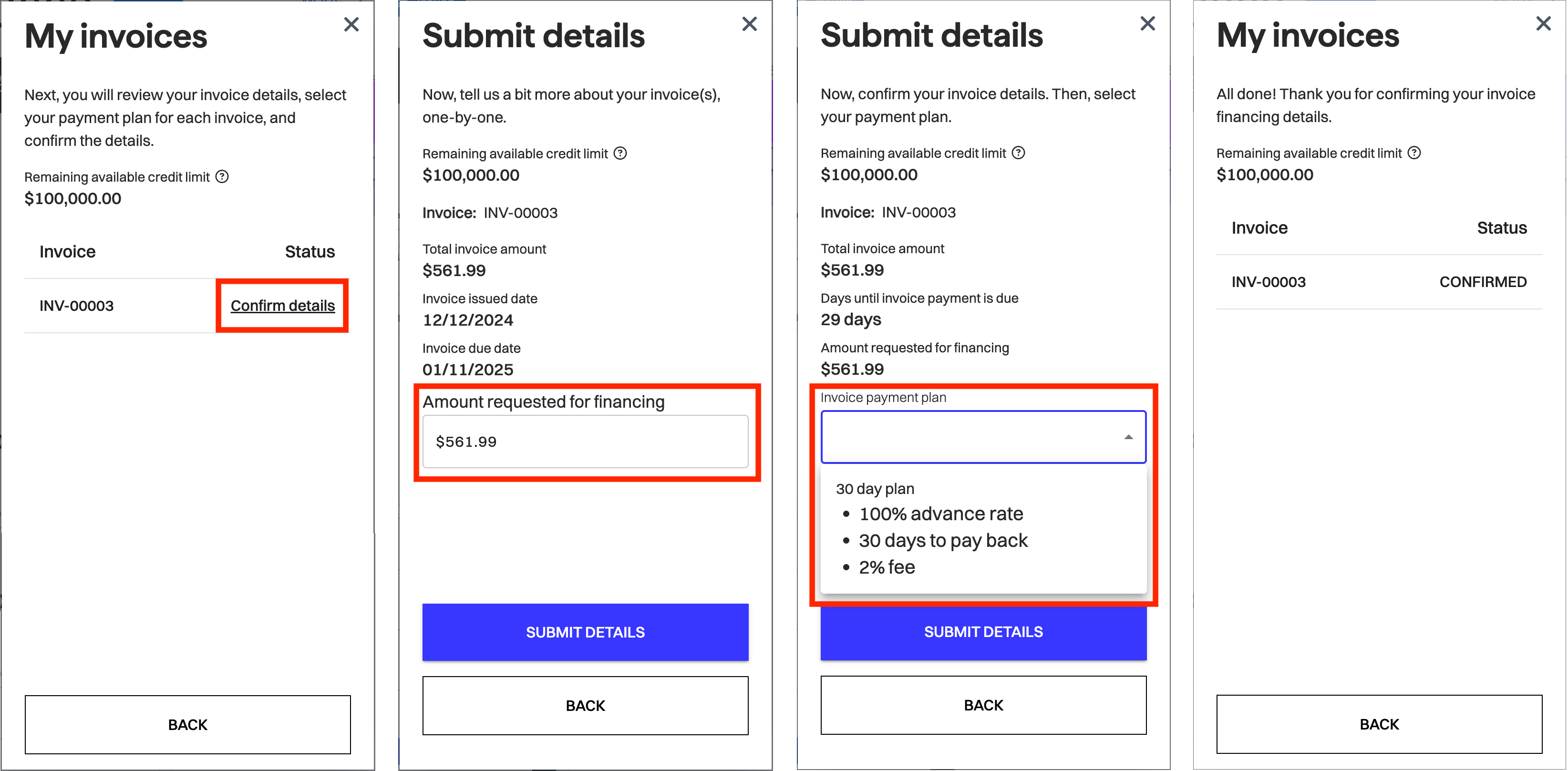 You can use theFinanceInvoice component to provide users with an entry point for financing an individual invoice.