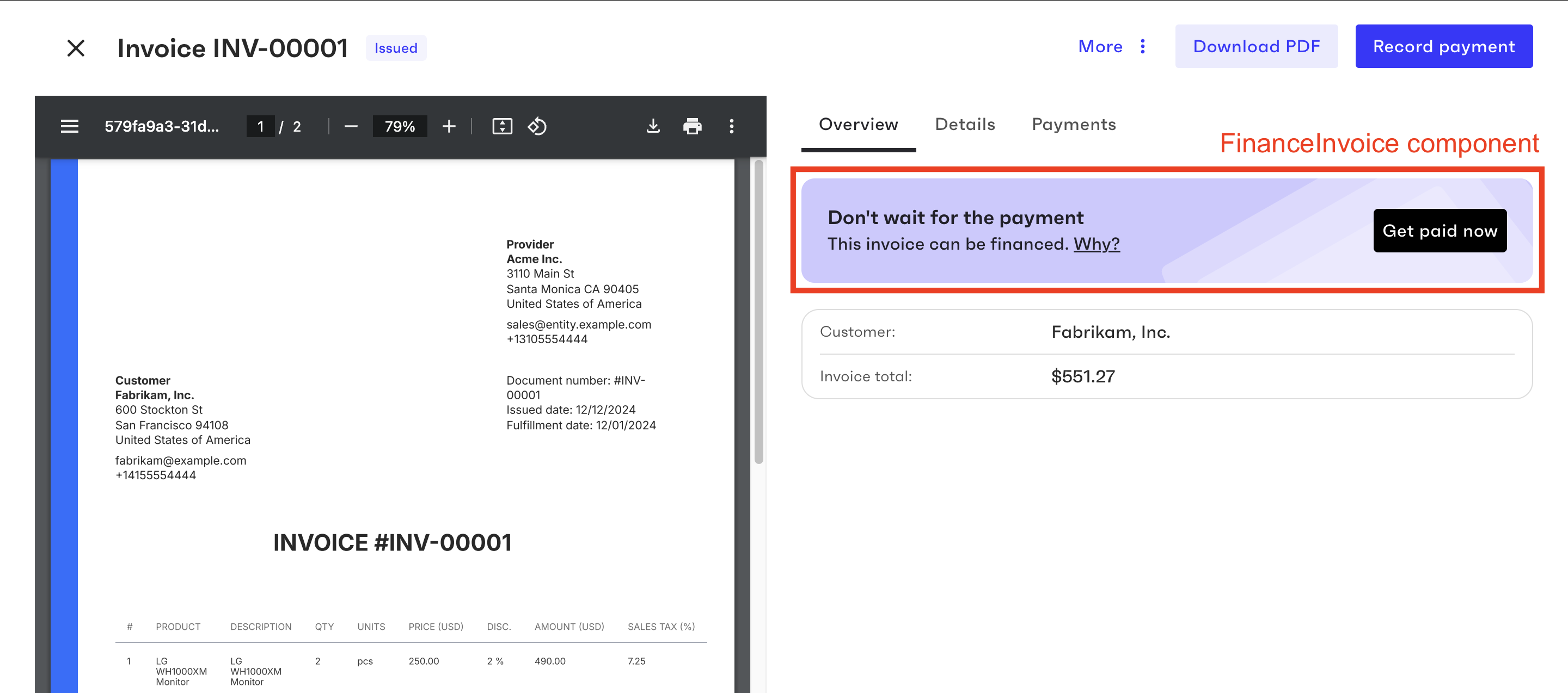 If the specified invoice object meets financing requirements, the FinanceInvoice component displays a banner indicating that financing is available for this invoice.