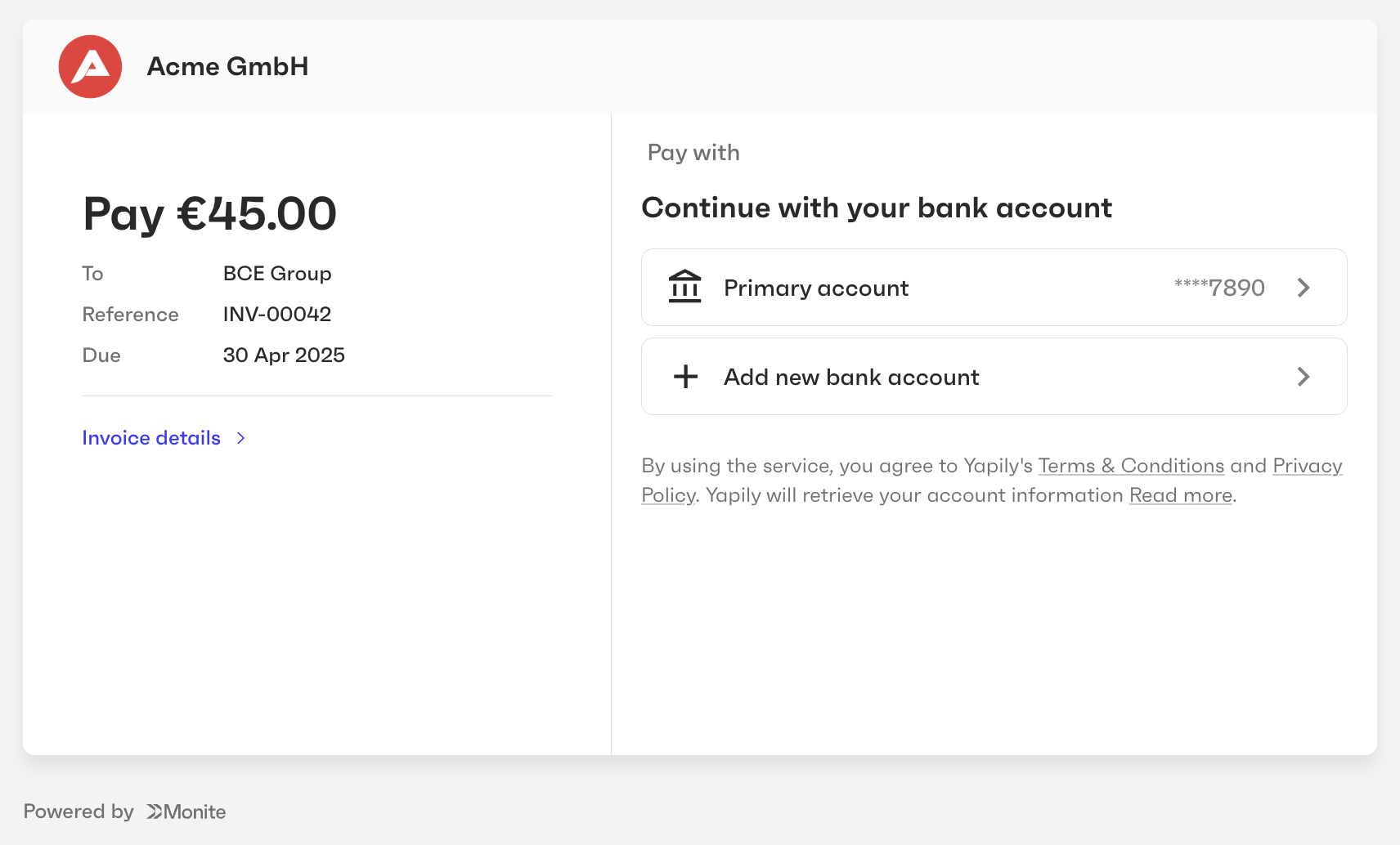 We’ve expanded our payment coverage to include Open Banking payments in Germany. Payment links created for German payers can now include a bank transfer payment option. This also expands the available payment options for accounts payable and accounts receivable:- German entities can use payment links to pay payables (bills).