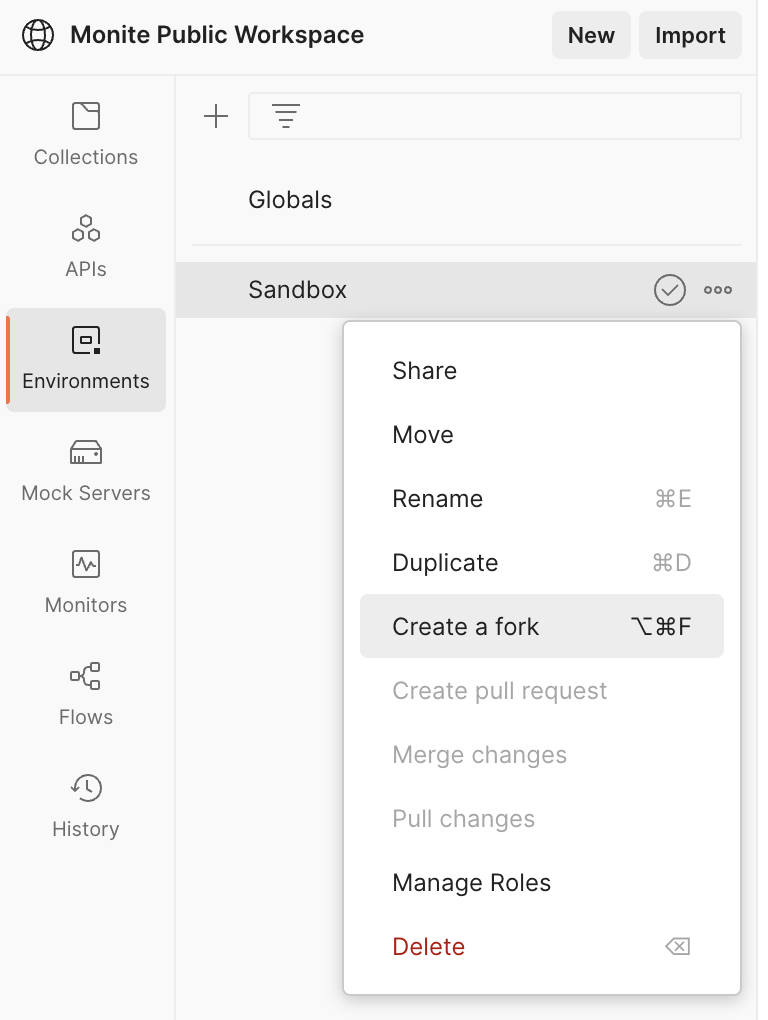 To be able to try out our public Postman collections, you need a Client ID and Client Secret. To get these credentials, create a Sandbox account in the Monite Partner Portal.2. Fork the Sandbox environment to your workspace