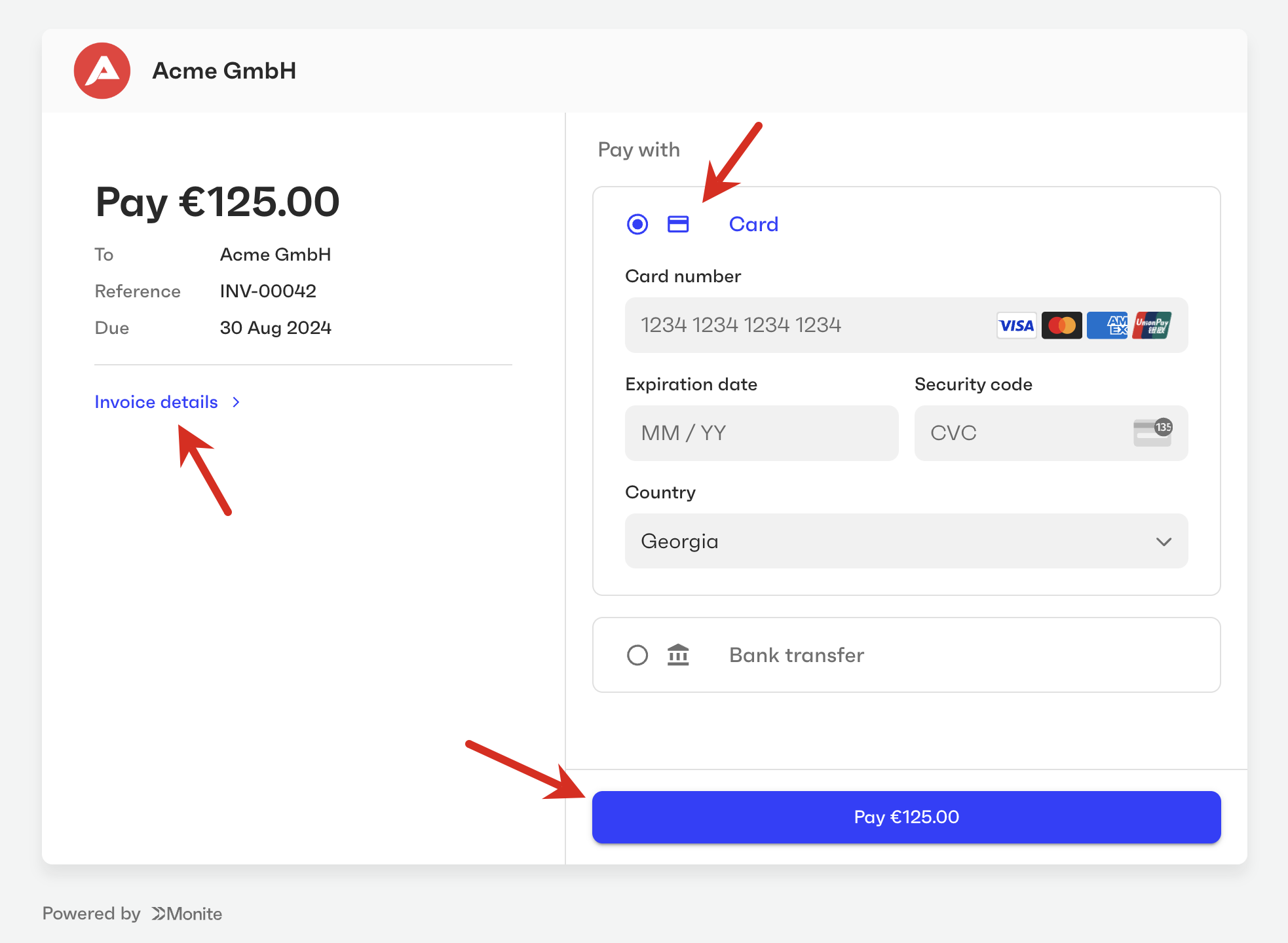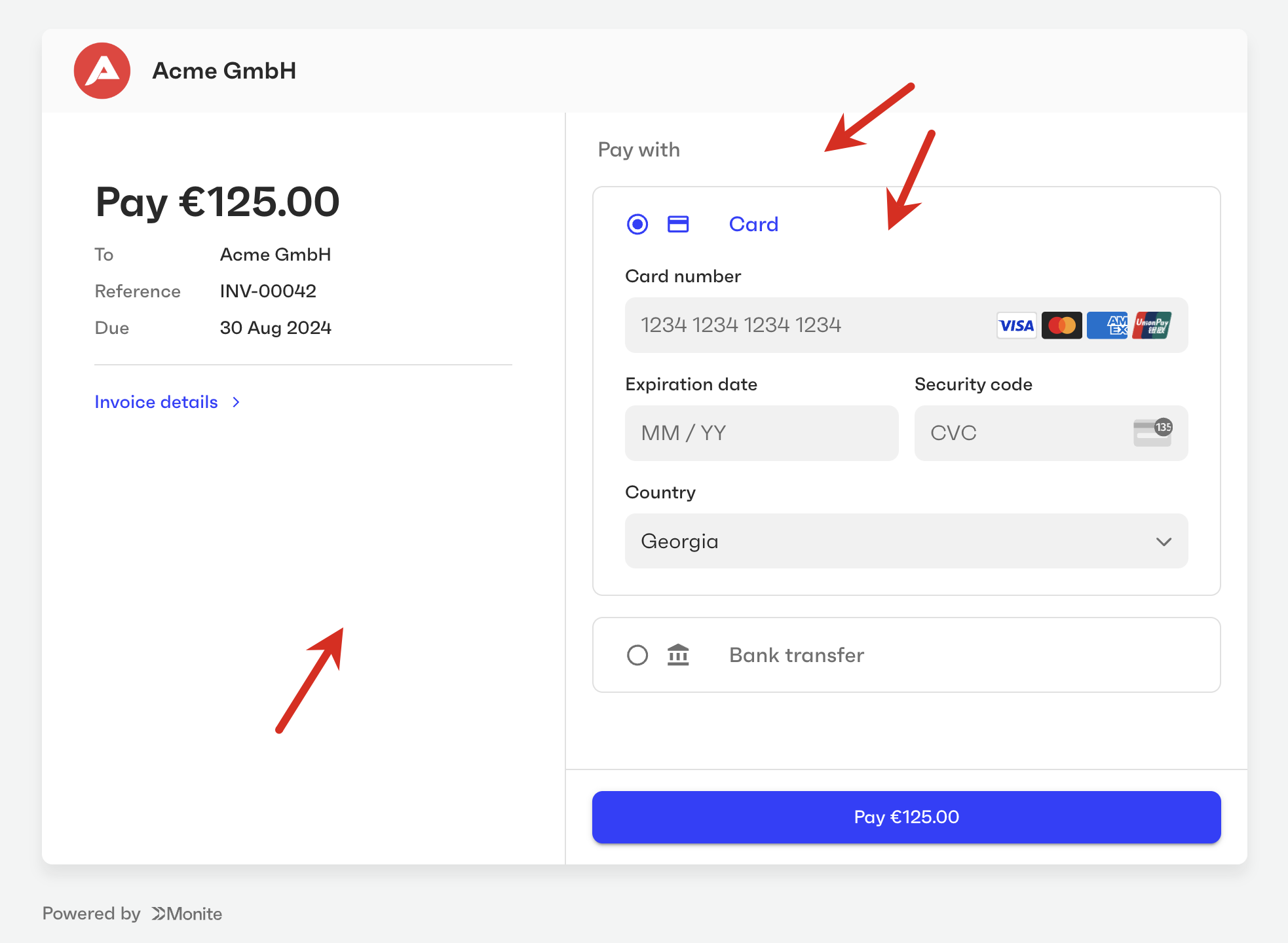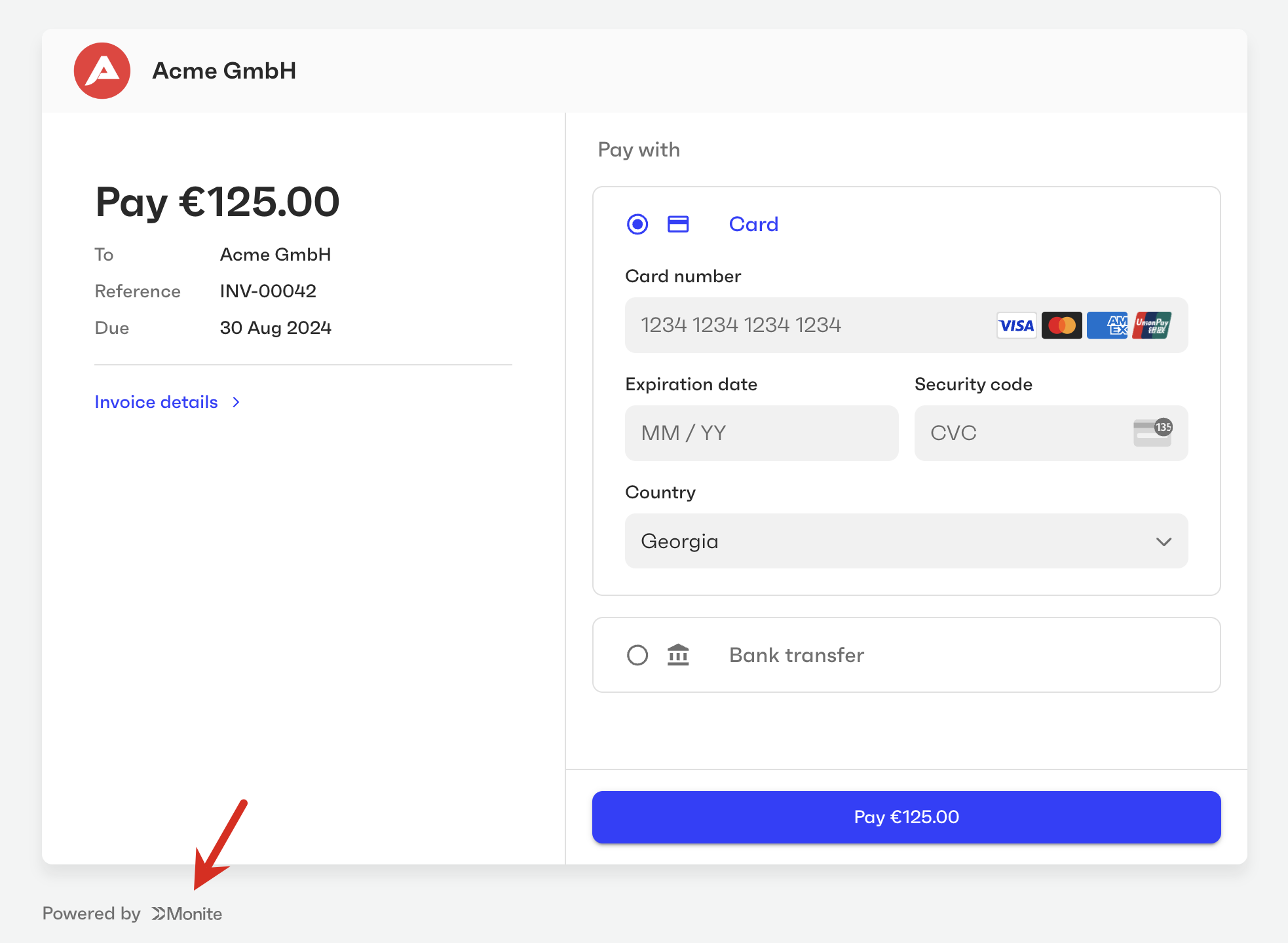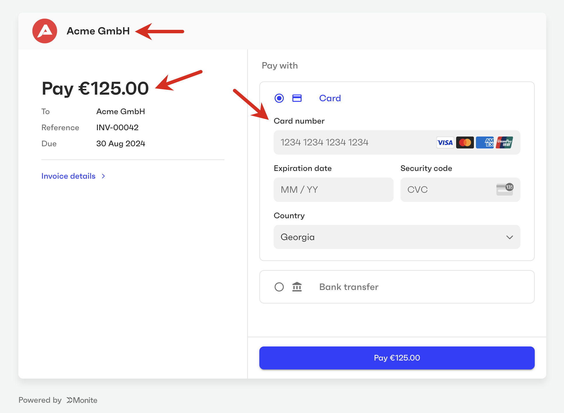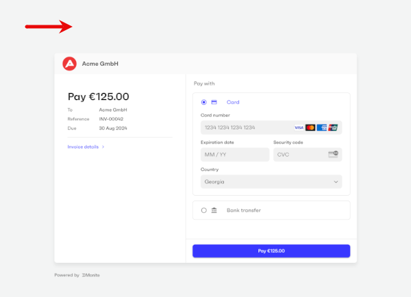 You can customize the user interface elements of Monite-hosted payment pages to fit your brand guidelines and make the payers feel that they are on your own platform. By default, the payment page displays the entity logo if available. If no logo was provided for an entity, the payment page displays your partner logo specified by the partner setting payments.payment_page_theme.logo_src. If neither logo is available, the page uses the entity name’s initials as the logo. The payment page expects a square logo 44×44 px, with a transparent background. Larger images will be scaled down to fit.
