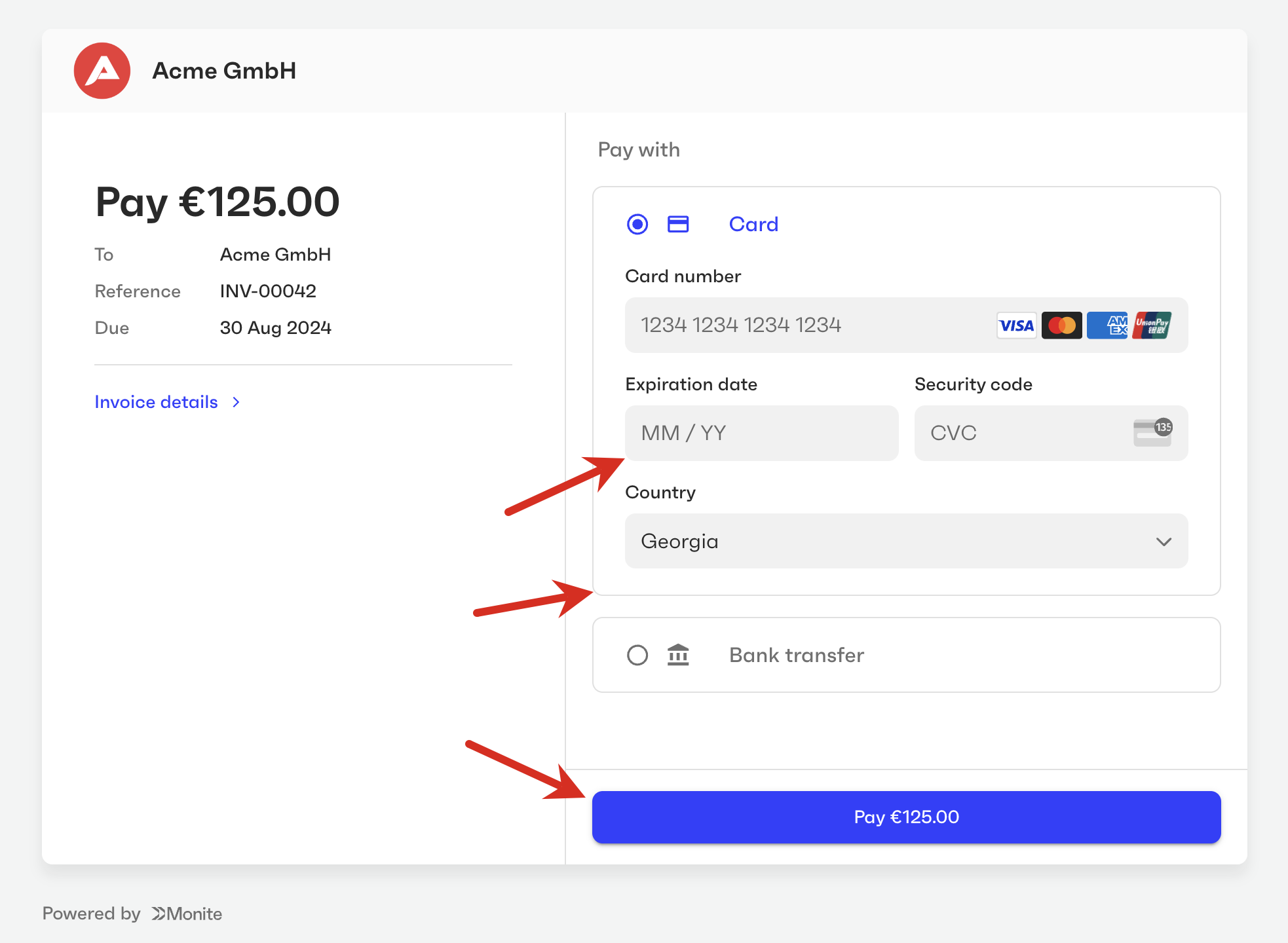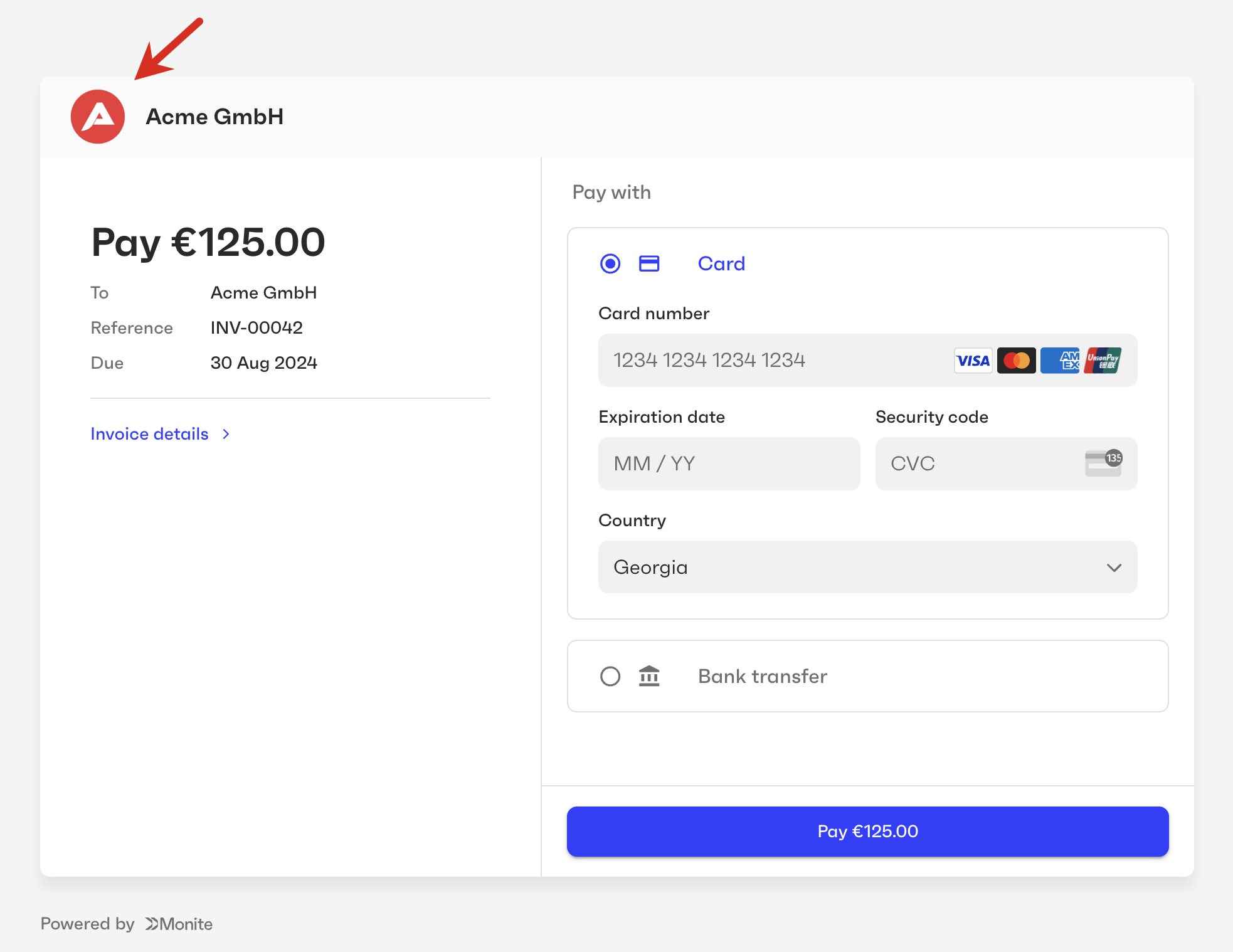You can customize the user interface elements of Monite-hosted payment pages to fit your brand guidelines and make the payers feel that they are on your own platform. By default, the payment page displays the entity logo if available. If no logo was provided for an entity, the payment page displays your partner logo specified by the partner setting payments.payment_page_theme.logo_src. If neither logo is available, the page uses the entity name’s initials as the logo. The payment page expects a square logo 44×44 px, with a transparent background. Larger images will be scaled down to fit.